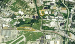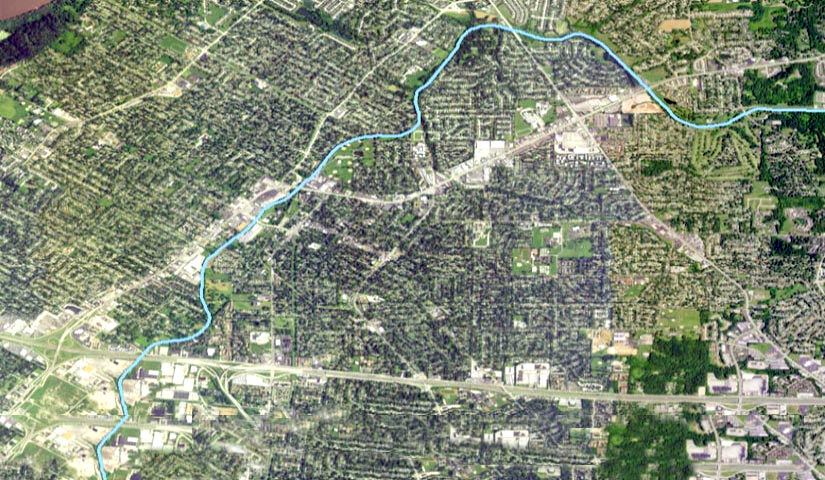 This is an aerial view of Cold Water Creek winding its way through north St. Louis, MO. Also included is a closeup of the creek and an aerial view of storage sites for radioactive waste. Source. CDC Archive